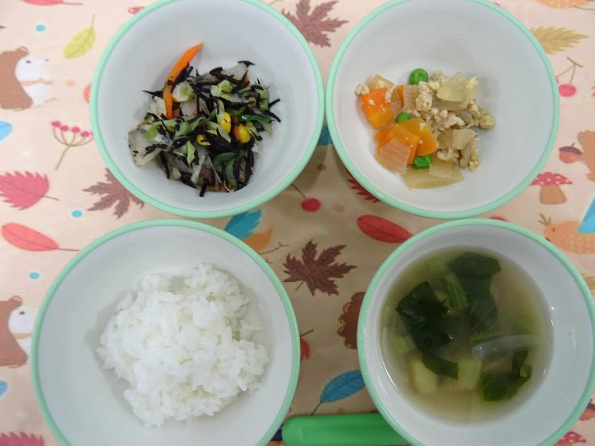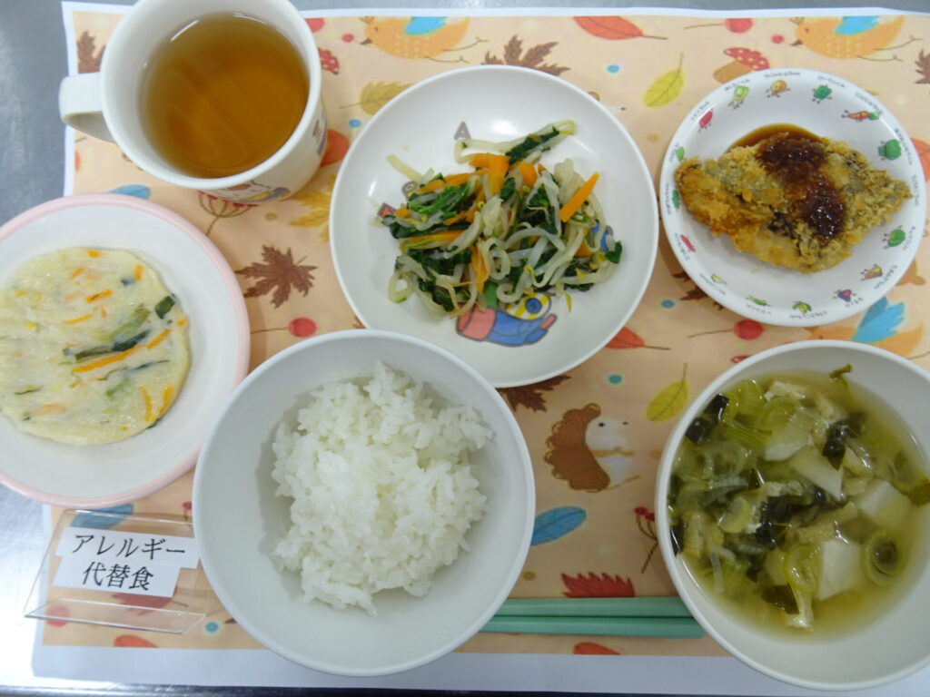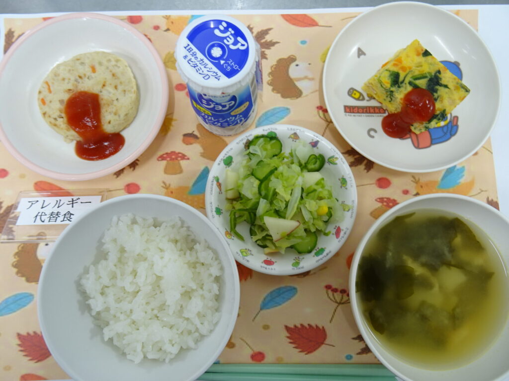 11月4日㈫ 具だくさんのオムレツとみんな大喜びのジョアです♪ ごはん ほうれん草オムレツ リンゴ入りコールスローサラダ みそ汁 ジョア (卵アレルギー代替え:豆腐ハンバーグ)