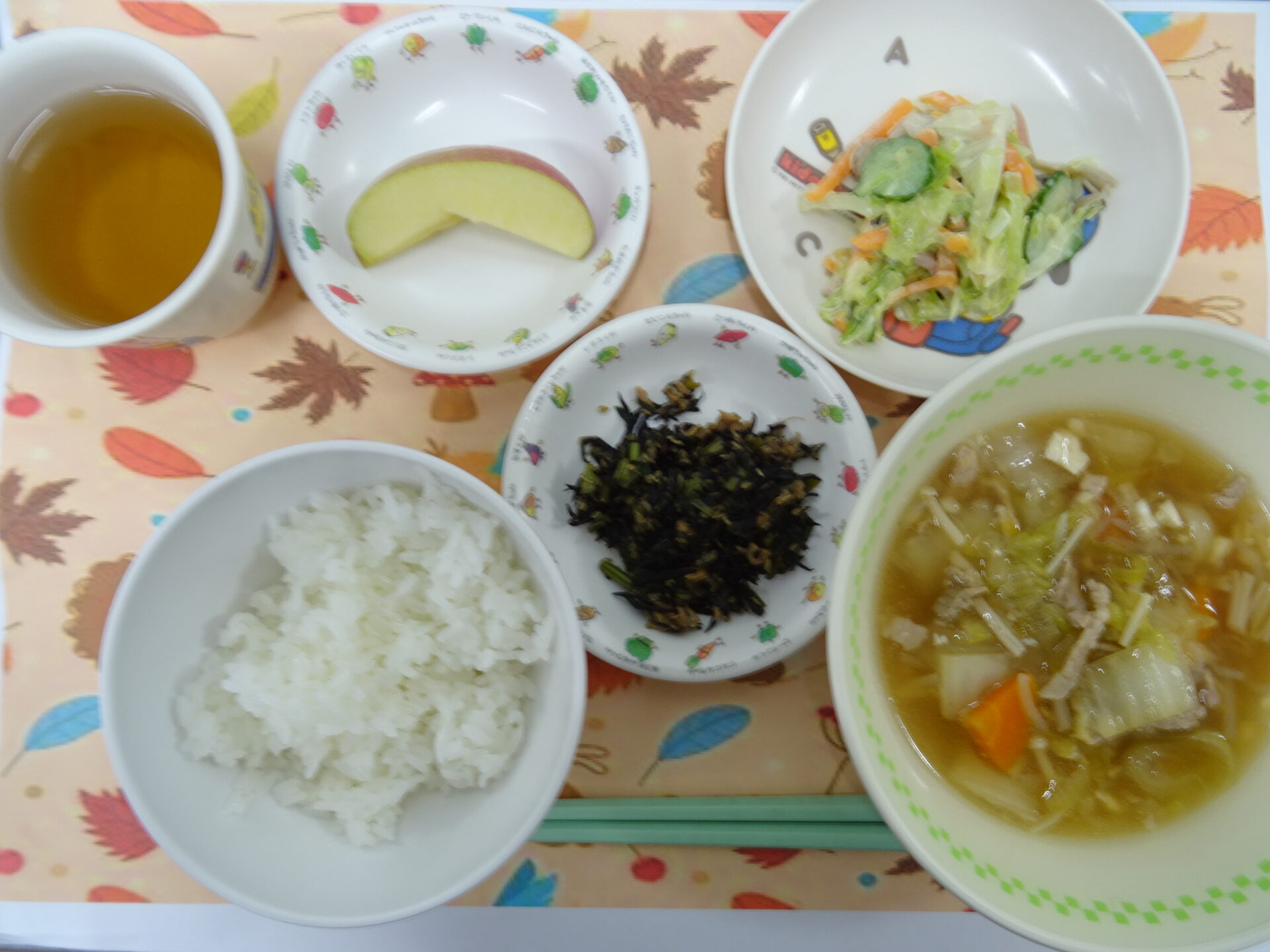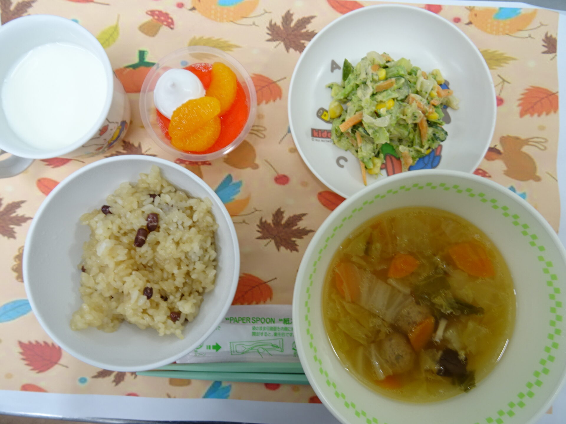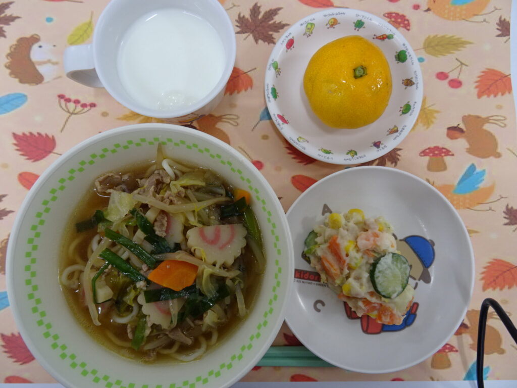 11月5日㈬ 幼稚園のラーメンは野菜たっぷりです♪ 醤油ラーメン ツナポテトサラダ みかん 牛乳