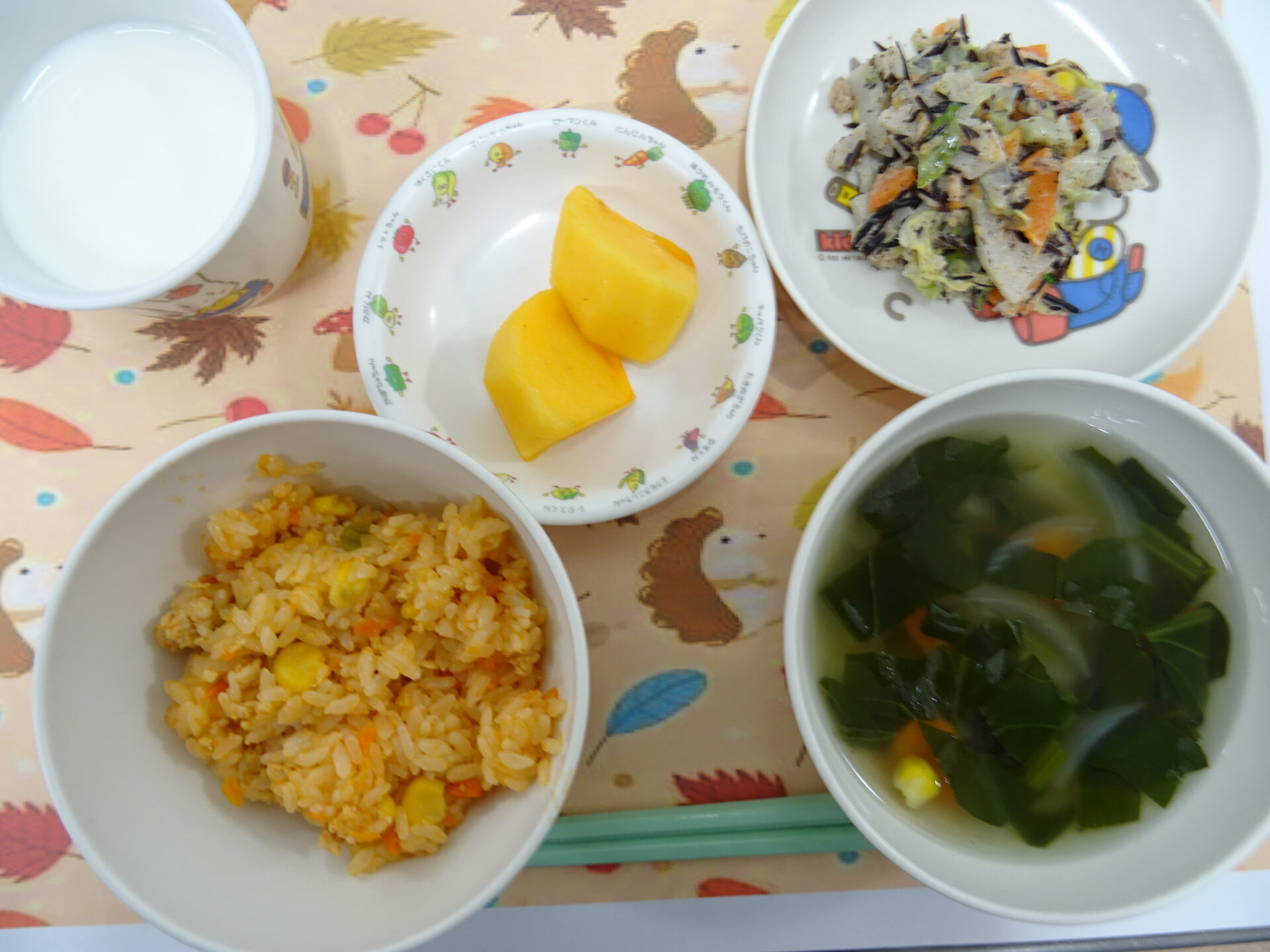11月7日㈮ れんこんは近くの大口蓮根です!とっても美味しいですよ♪ チキンピラフ レンコンサラダ 野菜スープ 柿 牛乳