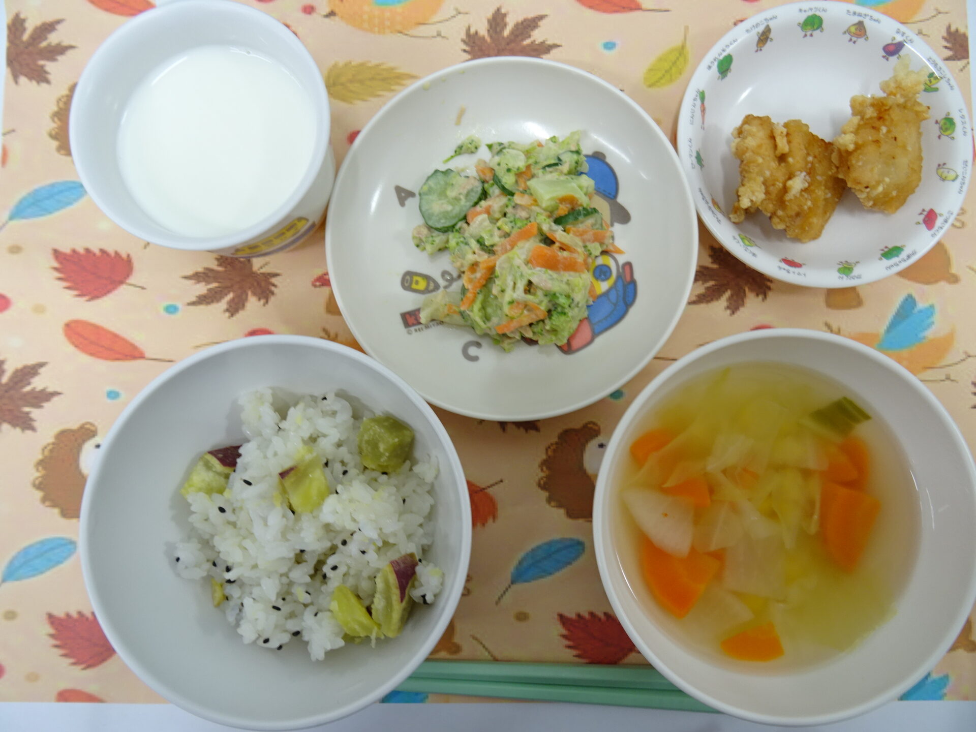 11月10日㈪ 今日はひまわり食育メニューの日です♪ひまわり組がみんなが元気になる給食の献立を考えてくれました。 さつま芋は先週ひまわり組が掘ったお芋を使用しています。 さつま芋ごはん 鶏のから揚げ ブロッコリーサラダ コンソメスープ 牛乳