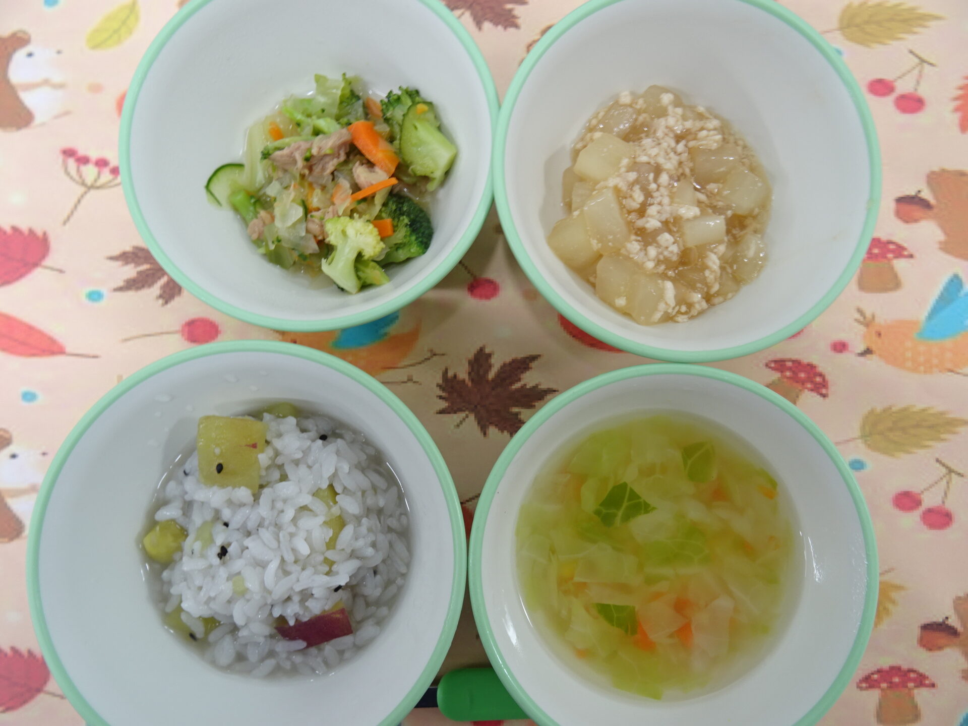 11月10日㈪ 離乳食 さつま芋軟飯 鶏肉と大根の煮物 ブロッコリーサラダ コンソメスープ
