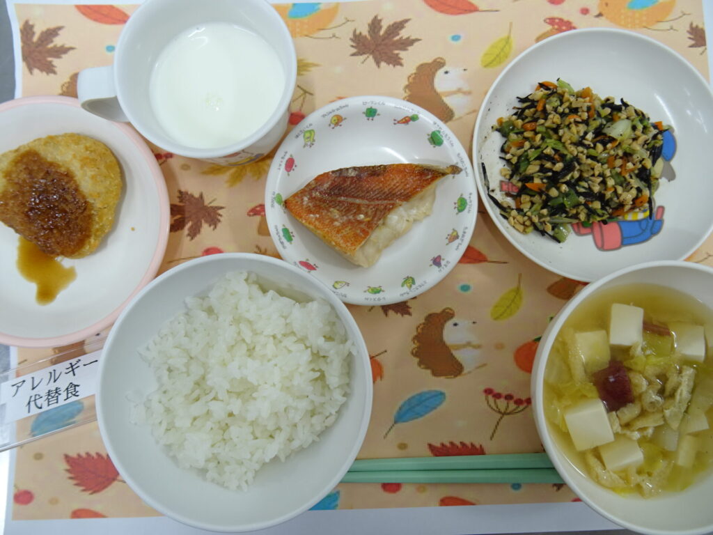 11月11日 元気が湧き出る鉄腕納豆です♪お味噌汁のお芋は幼稚園の畑のお芋です♪ ごはん 赤魚の西京焼き 鉄腕納豆 みそ汁 牛乳(魚介アレルギー代替え:かぼちゃひき肉フライ)