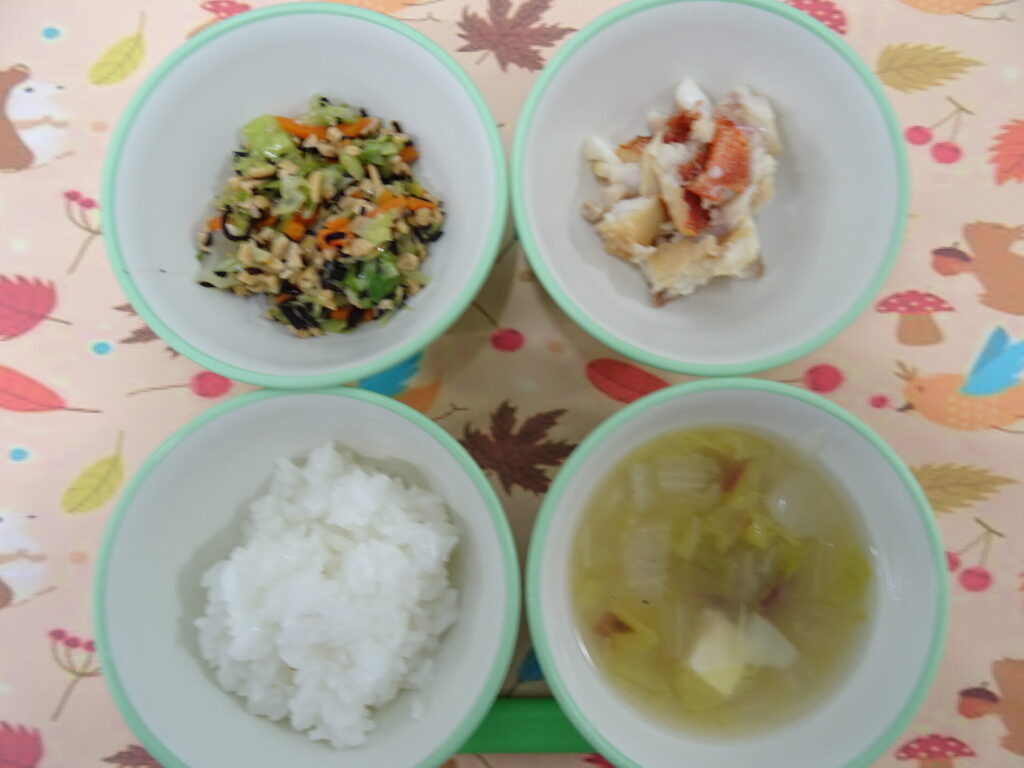 12月1日㈪ 今日はふたば・すみれ組 すずらん組でしゃかしゃかおにぎり作りを行いました。みんな楽しそうに紙コップを振っていました♪ ごはん カミカミごぼうハンバーグ 青菜とツナの酢味噌和え みそ汁 牛乳 (魚介アレルギー:酢味噌和えのツナ除去)