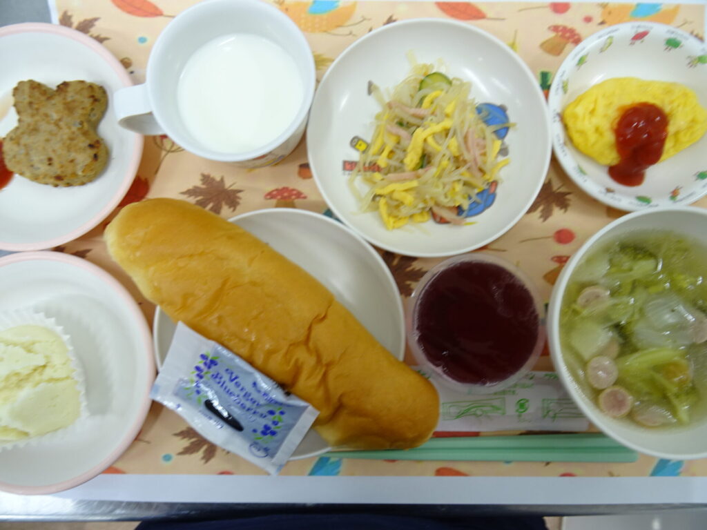 11月12日㈬ 今日はちゅうりっぷ組のリクエスト給食の日です♪「おかわり~」の声がたくさん聞こえてきそうです♪ コッペパン ブルーベリージャム オムレツ 中華サラダ ポトフ風スープ ぶどうゼリー 牛乳  (卵、小麦アレルギー:オムレツ→ハンバーグ代替え  サラダの錦糸卵除去)(小麦アレルギー:コッペパン→米粉蒸しパン)