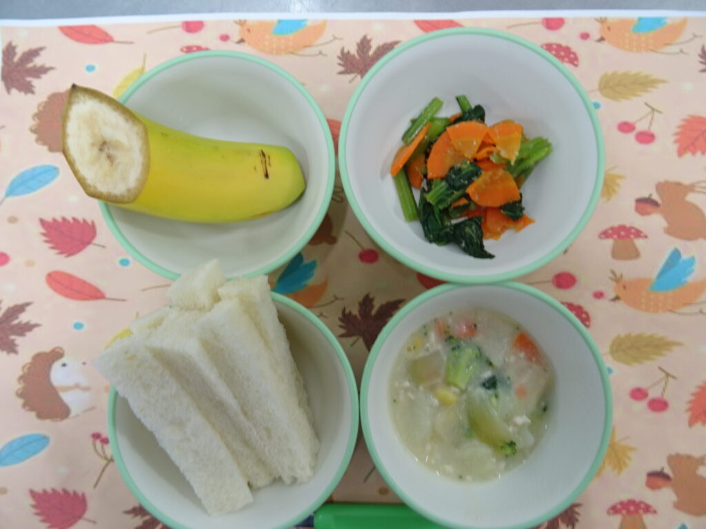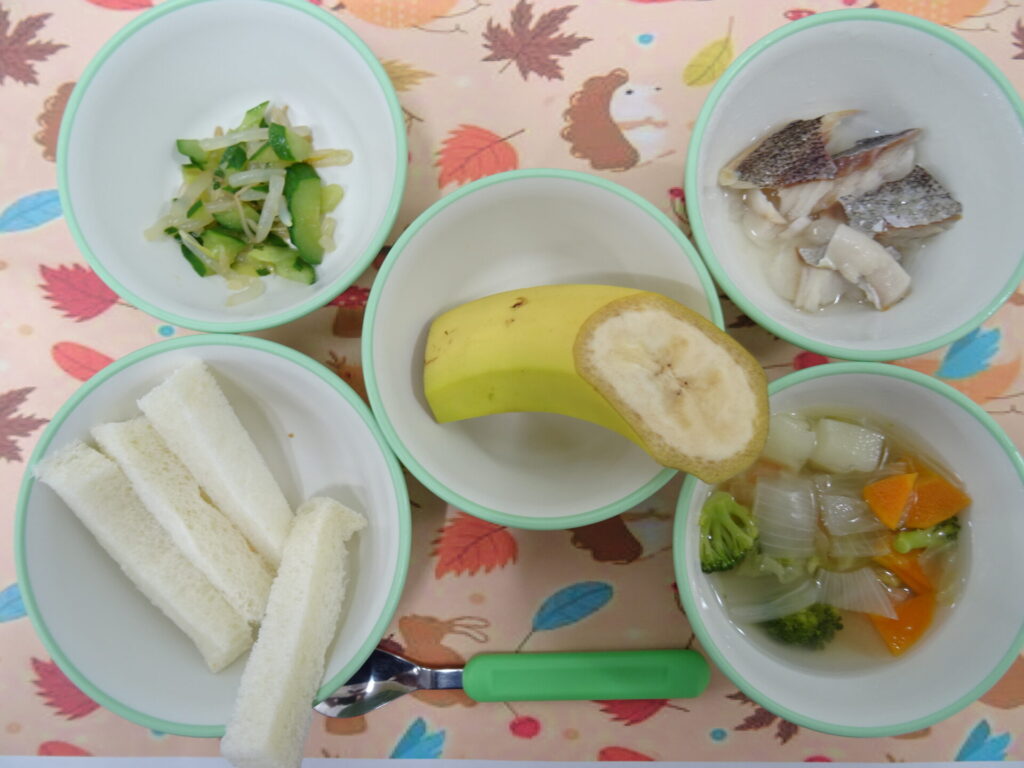 11月12日㈬ 離乳食 食パン たらのコンソメ煮 もやしの中華サラダ ポトフ風スープ バナナ
