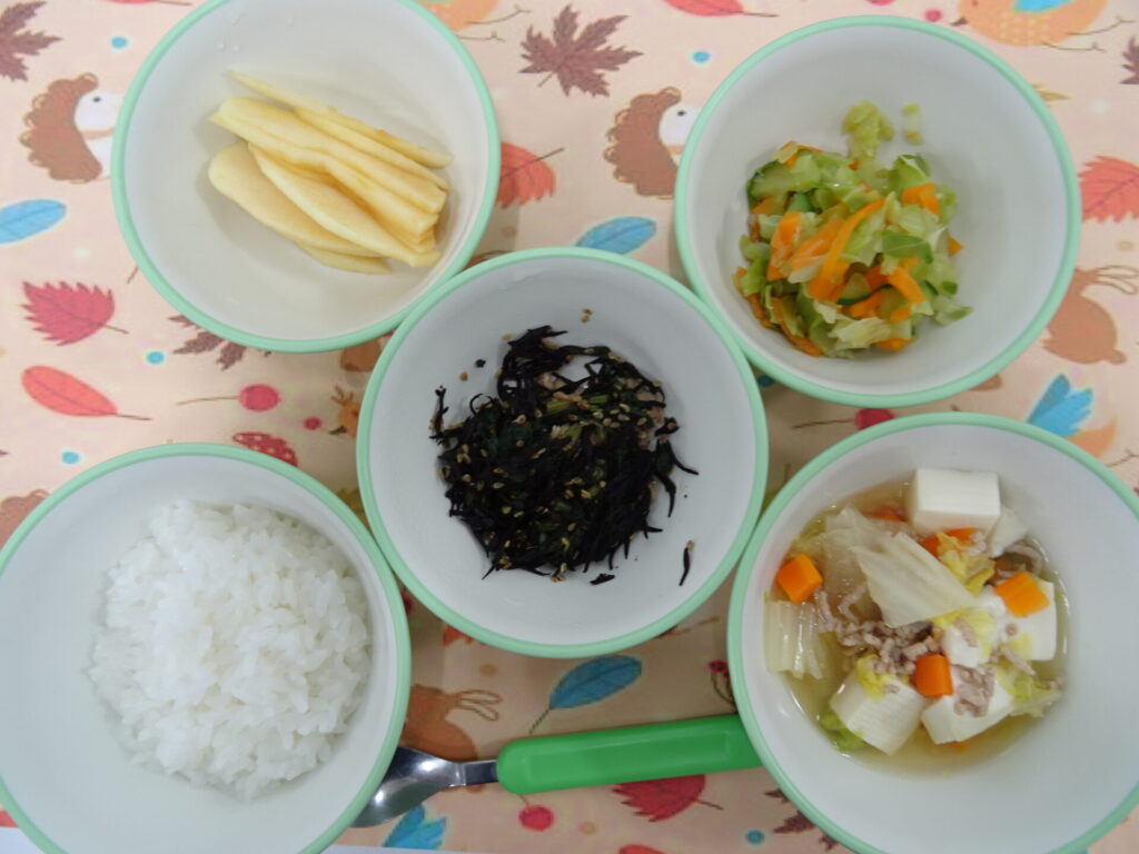 11月13日㈭ 離乳食 軟飯 ツナひじきふりかけ 肉豆腐 野菜サラダ りんご