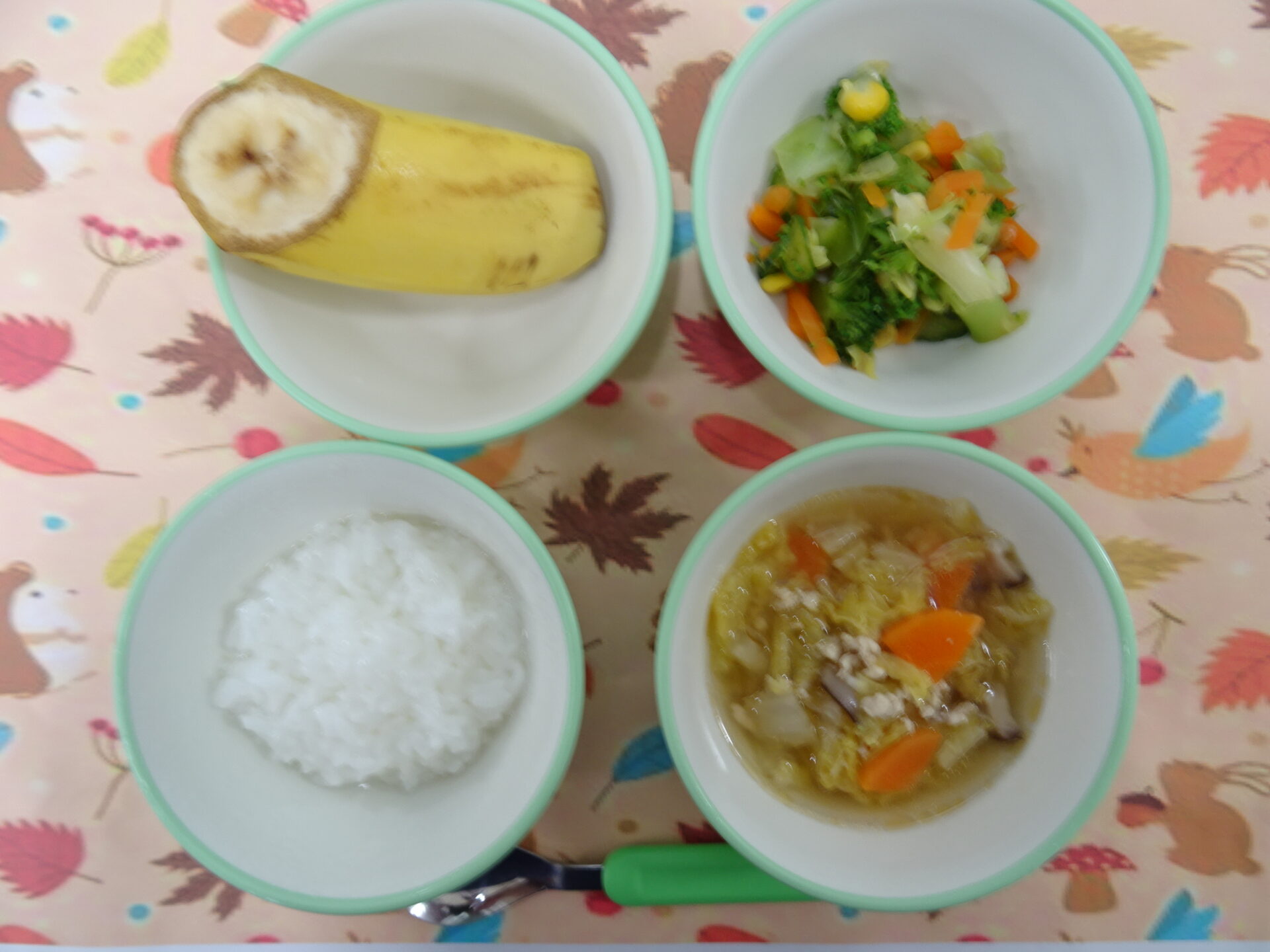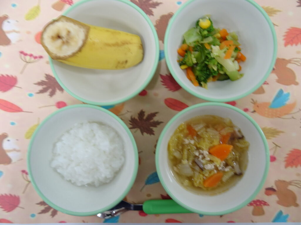 11月14日㈮ 離乳食 軟飯 ブロッコリーサラダ 鶏肉と白菜のスープ バナナ