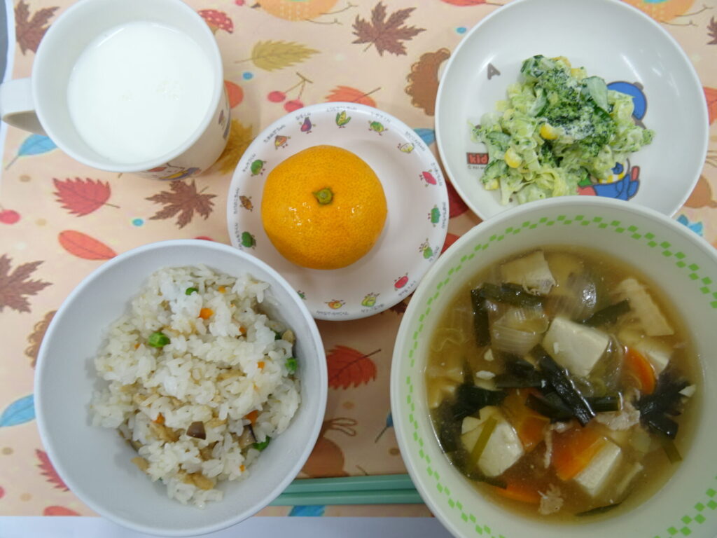 11月17日㈪ 秋の味覚たっぷりのまぜごはんです♪ きのこごはん 豆腐の中華煮 きみどり和え みかん 牛乳