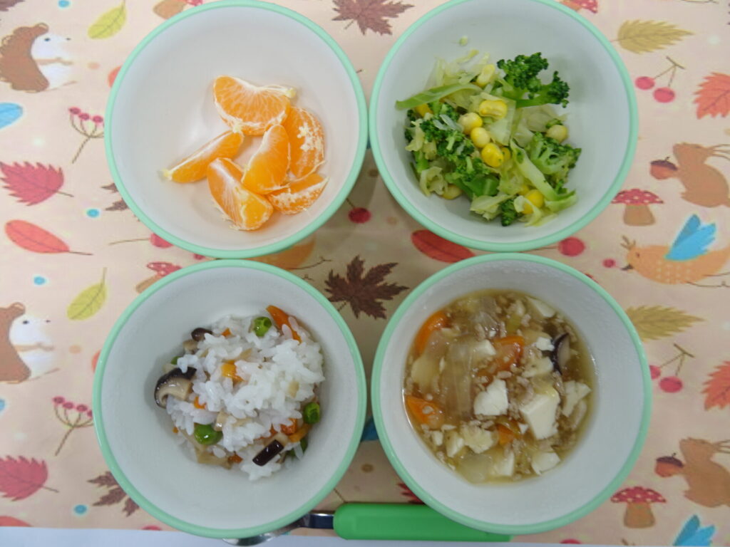 11月17日㈪ 離乳食 きのこ軟飯 豆腐の中華煮 きみどり和え みかん