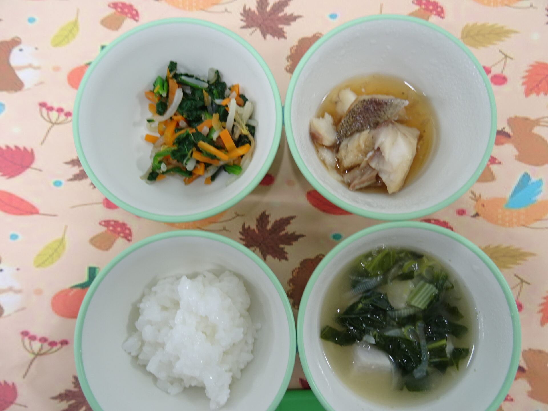 11月18日㈫ 軟飯 たらの煮物 3色お浸し みそ汁