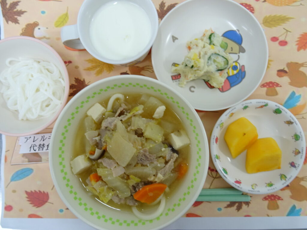 11月20日㈭ 温かい豚汁うどんで体も心もぽっかぽかです♪ 豚汁うどん じゃがじゃこサラダ 柿 牛乳  (小麦アレルギー:米粉めん代替え 魚介アレルギー:しらす除去)