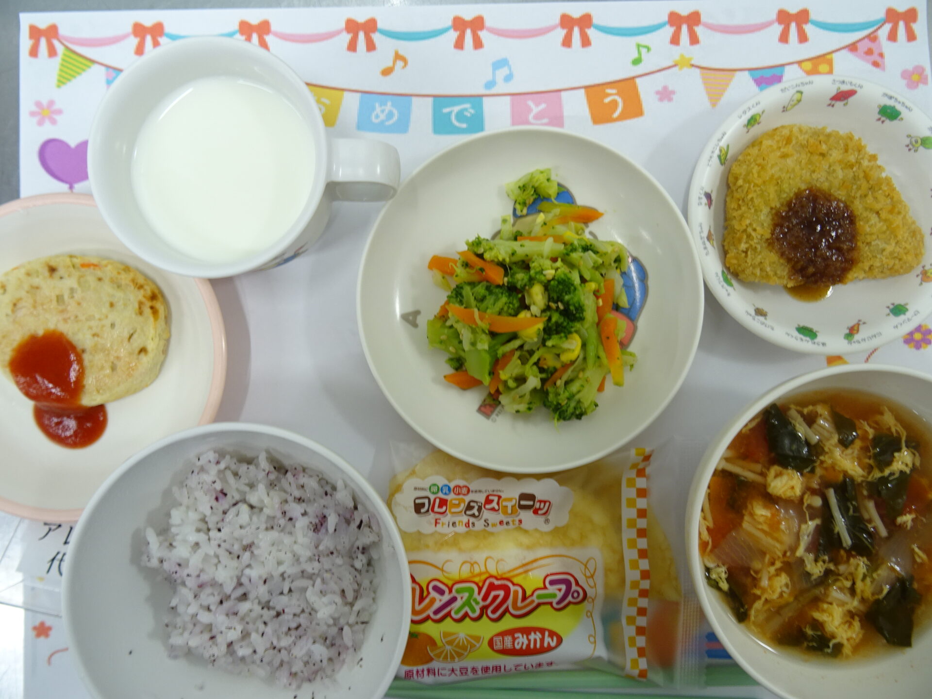 11月26日㈬ 11月生まれさんお誕生日おめでとうございます♪ ゆかりご飯 かぼちゃひき肉フライ ブロッコリーサラダ トマトと卵のスープ ミニクレープ 牛乳  (小麦アレルギー:豆腐ハンバーグ代替え) (魚介アレルギー:揚げ油別) (卵アレルギー:スープの卵除去)