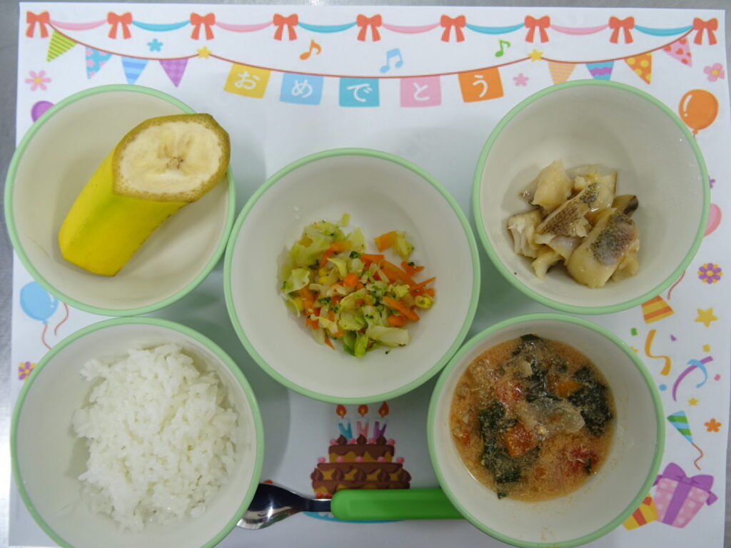 11月26日㈬ 離乳食 ご飯 たらの煮物 ブロッコリーサラダ トマトと卵のスープ バナナ