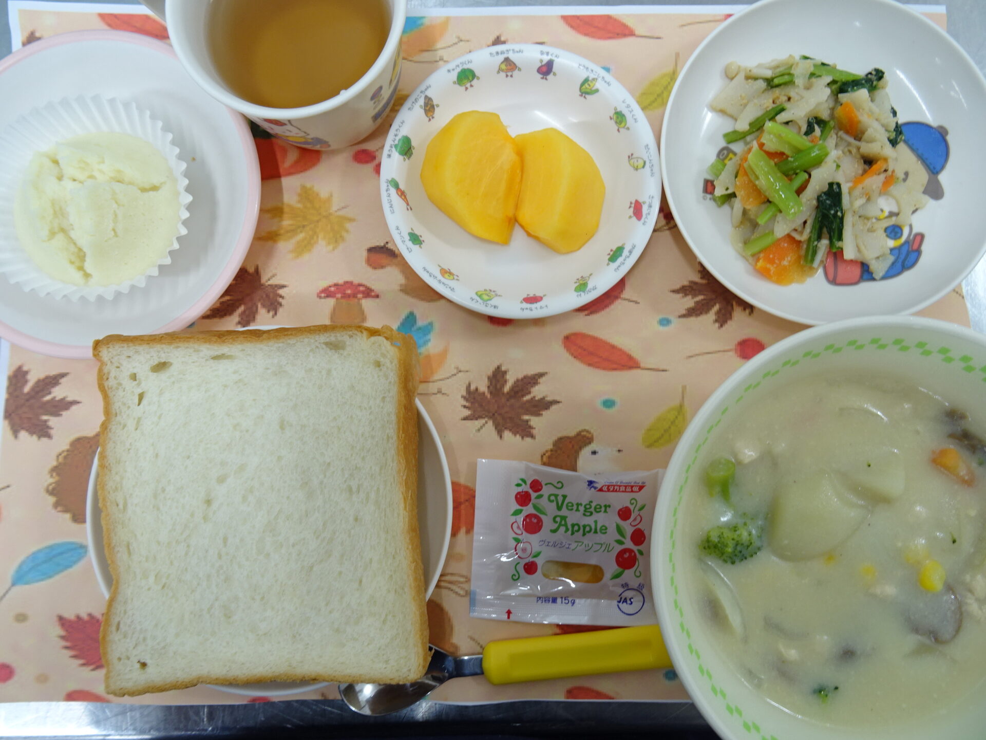 11月27日㈭ 幼稚園の近くで育った蓮根のサラダです♪ 食パン リンゴジャム クリームシチュー れんこんのごま酢和え 柿 麦茶 (小麦アレルギー:米粉蒸しパン)