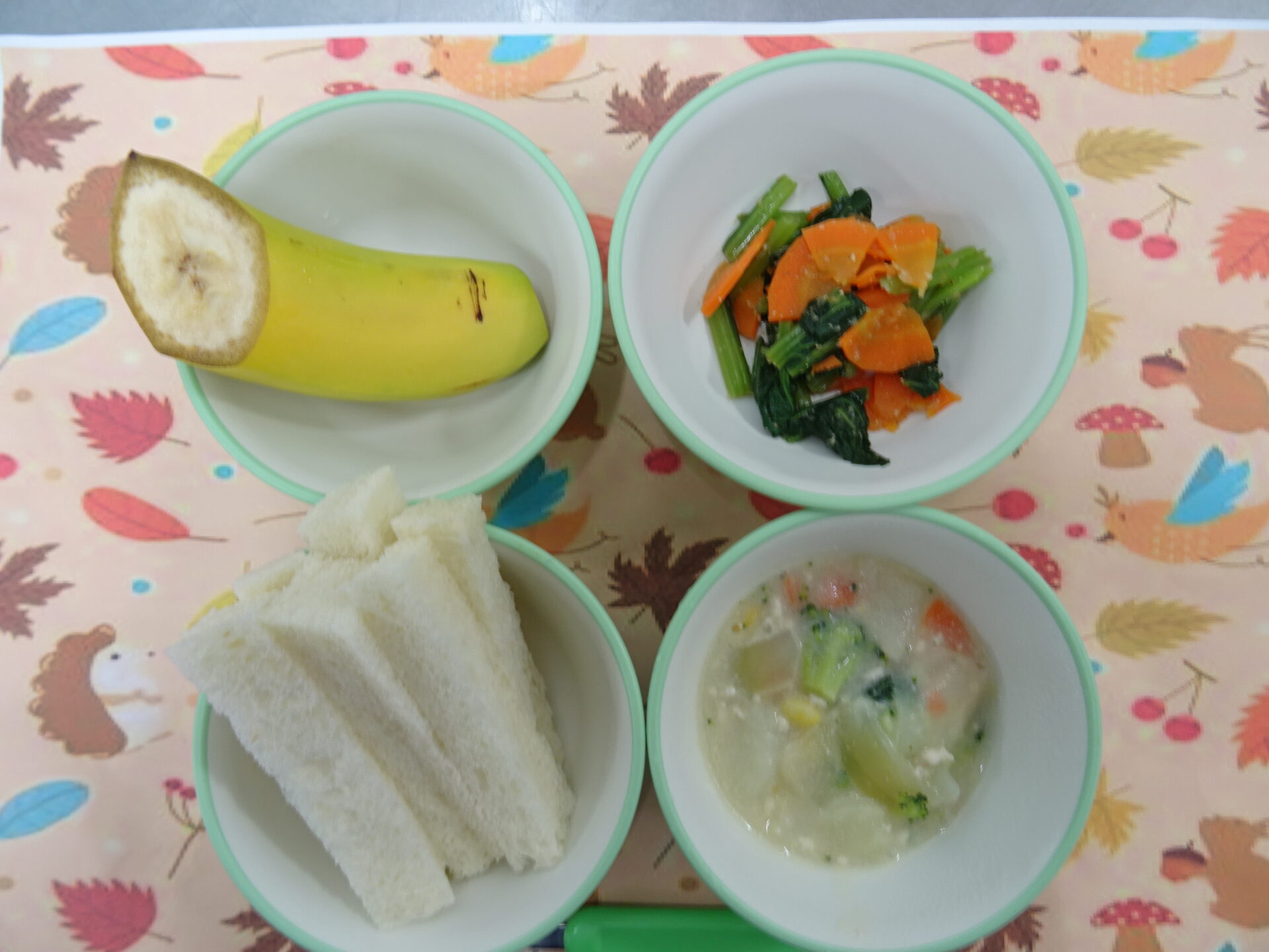 11月27日㈭ 離乳食 食パン クリームシチュー 小松菜の胡麻和え バナナ