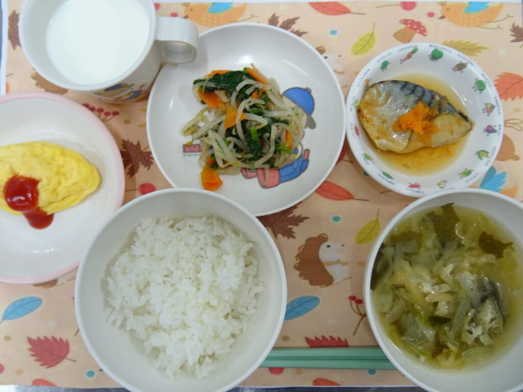 11月28日㈮ さばを煮るときは素焼きしてから煮ると生臭さが減りますよ♪ ごはん さばのもみじ煮 もやしと青菜のおかか和え みそ汁 牛乳 (魚介アレルギー:オムレツ代替え)