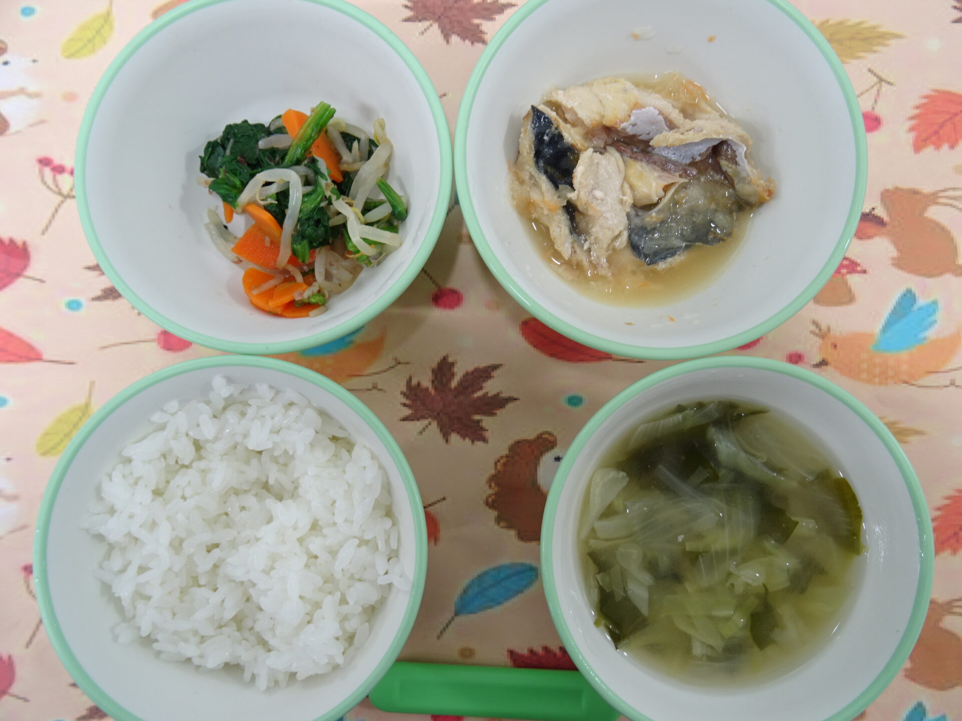 11月28日㈮ 離乳食 ごはん さばのもみじ煮 もやしと青菜のおかか和え みそ汁