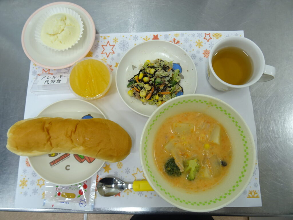 12月15日㈪ 今日はひまわり組でバスケ教室がおこなわれました!それにちなんでアルビメニューです♪ コッペパン りんごジャム アルビスープ ひじきのツナマヨサラダ アルビオレンジゼリー 麦茶 (小麦アレルギー:米粉蒸しパン)