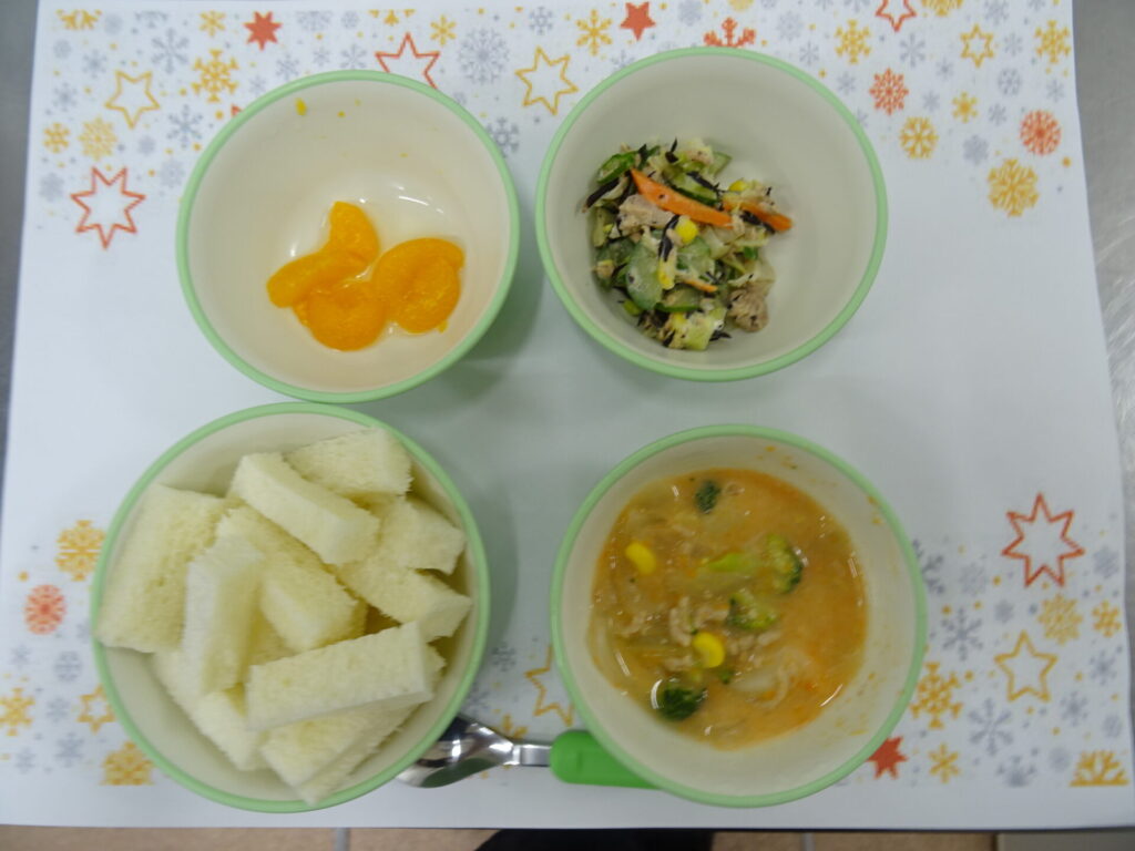 12月15日㈪ 離乳食 食パン アルビスープ ツナマヨサラダ みかん缶