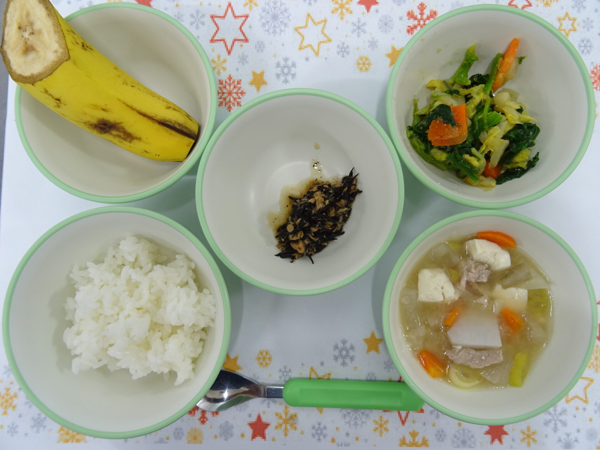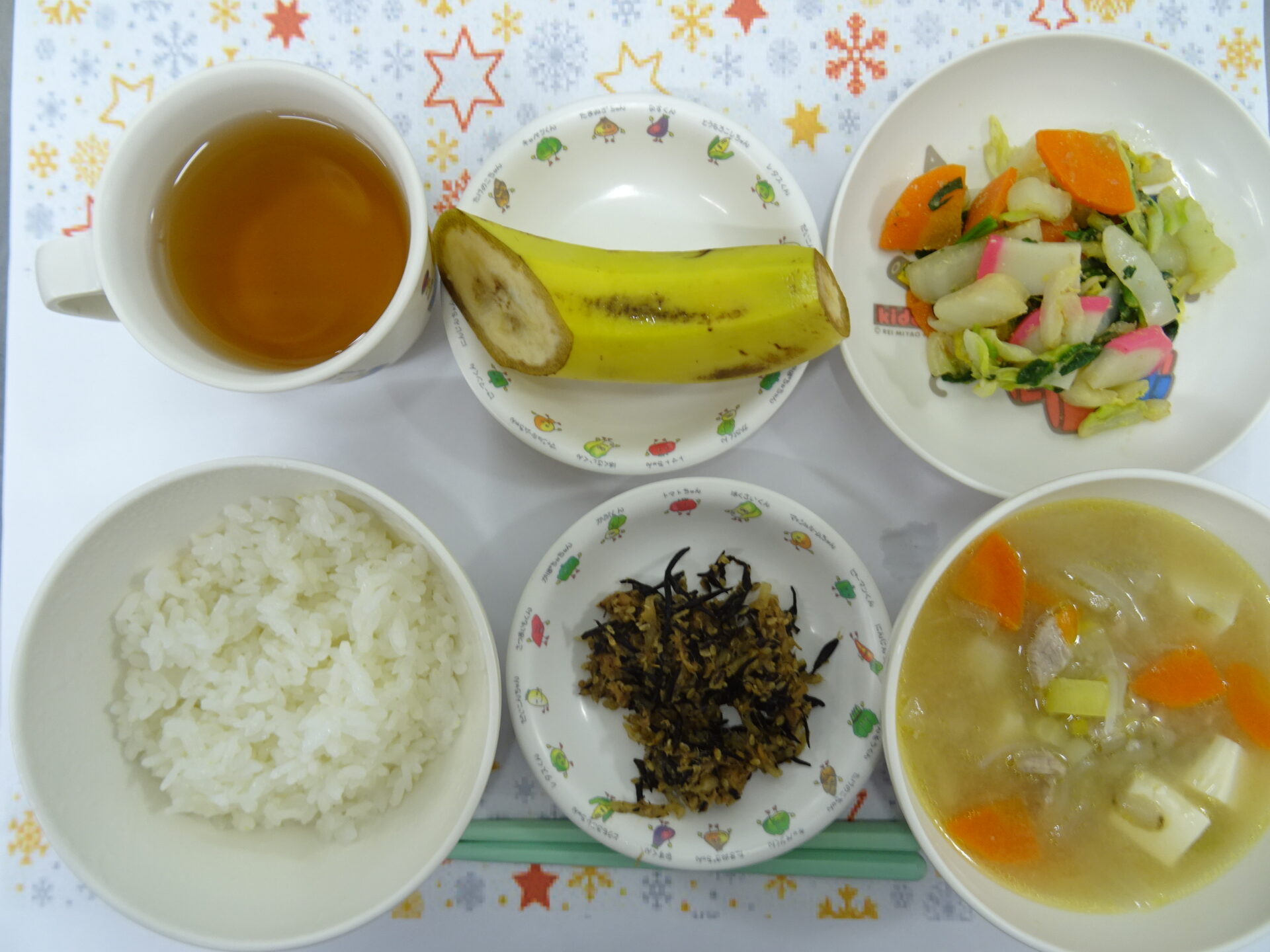 12月16日㈫ とらねこの様な色あいからのネーミングです♪ ごはん とらねこふりかけ 白菜の胡麻和え 冬野菜豚汁 バナナ 麦茶 (魚介アレルギー:ふりかけのツナ除去)