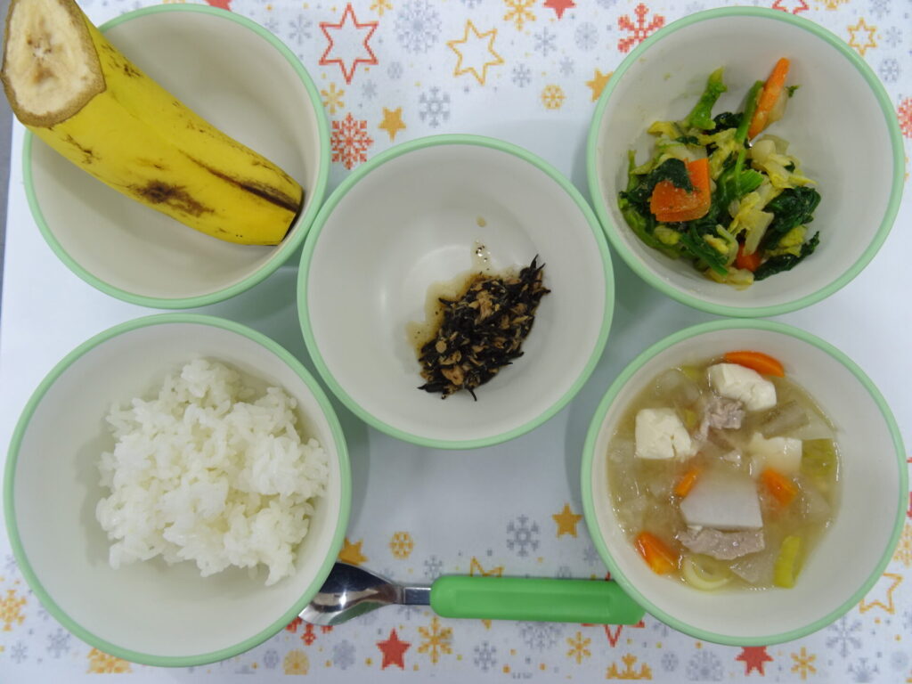 12月16日㈫ 離乳食 ごはん とらねこふりかけ 白菜の胡麻和え 冬野菜豚汁 バナナ