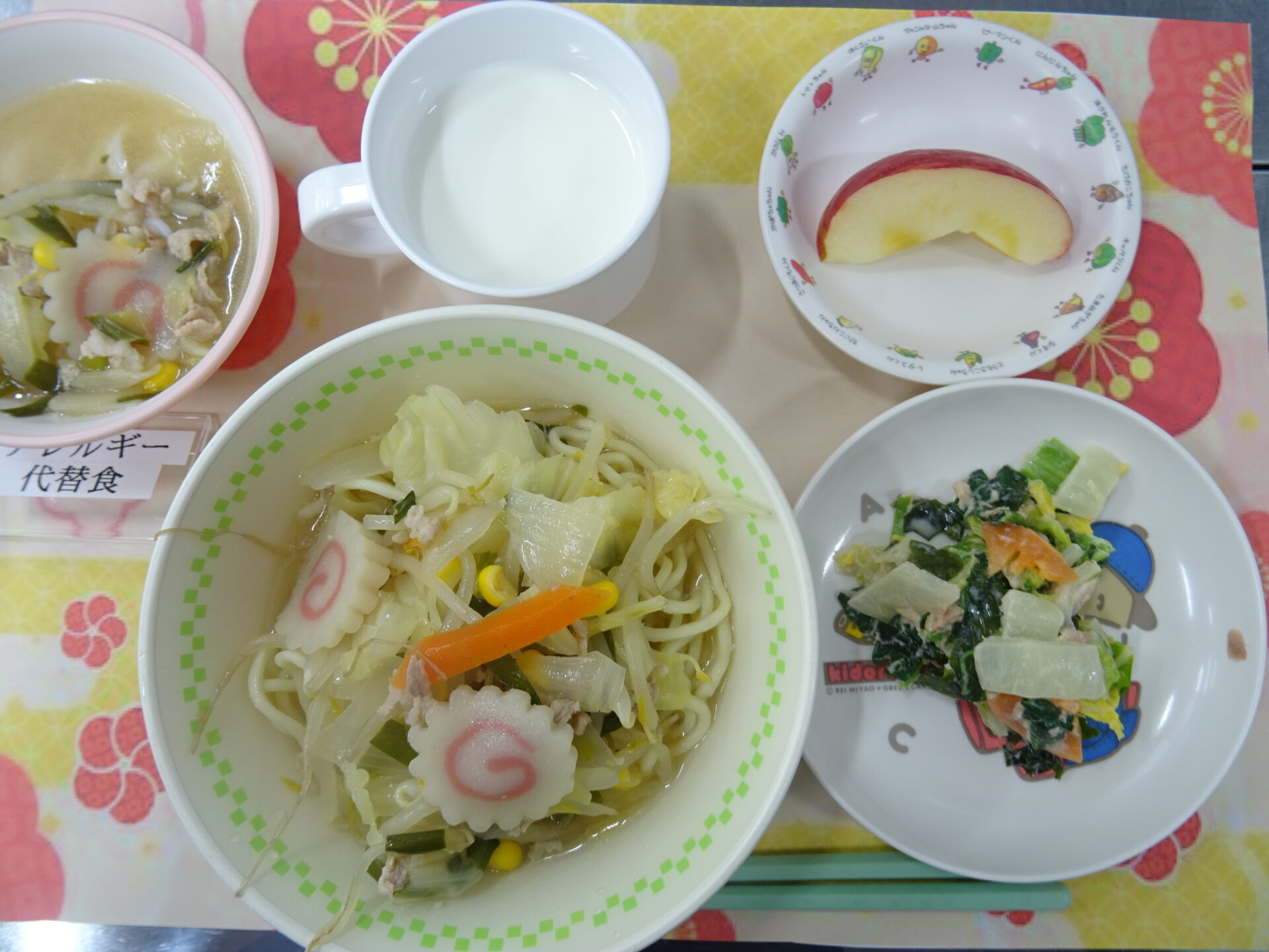 1月14日㈬ 温かいラーメンで体も心も温まろう!! 味噌ラーメン 白菜とツナのマヨネーズ和え りんご 牛乳 (小麦アレルギー:米粉めん代替え)(魚介アレルギー:和え物のツナ除去)