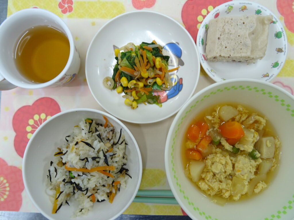 1月15日㈭ 今日は小正月ですね!小豆を使用した蒸しパンで小正月を楽しみましょう♪ ひじきご飯 高野豆腐の卵とじ 五色和え 小豆蒸しパン 麦茶 (卵アレルギー:鶏卵除去)