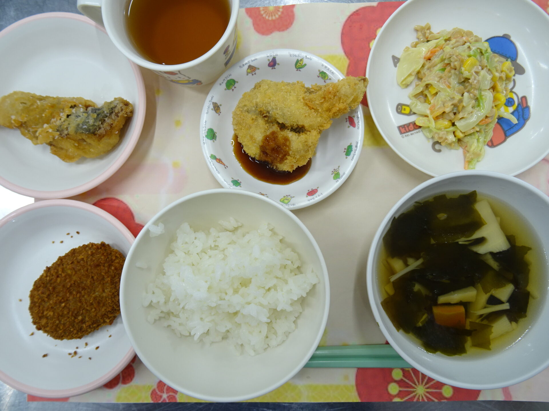 1月16日㈮ アジフライは給食室でパン粉を付けました♪ ご飯 アジフライ 納豆サラダ 筍とえのきの中華スープ 麦茶 (魚介アレルギー:メンチカツ)(小麦アレルギー:アジの竜田揚げ)
