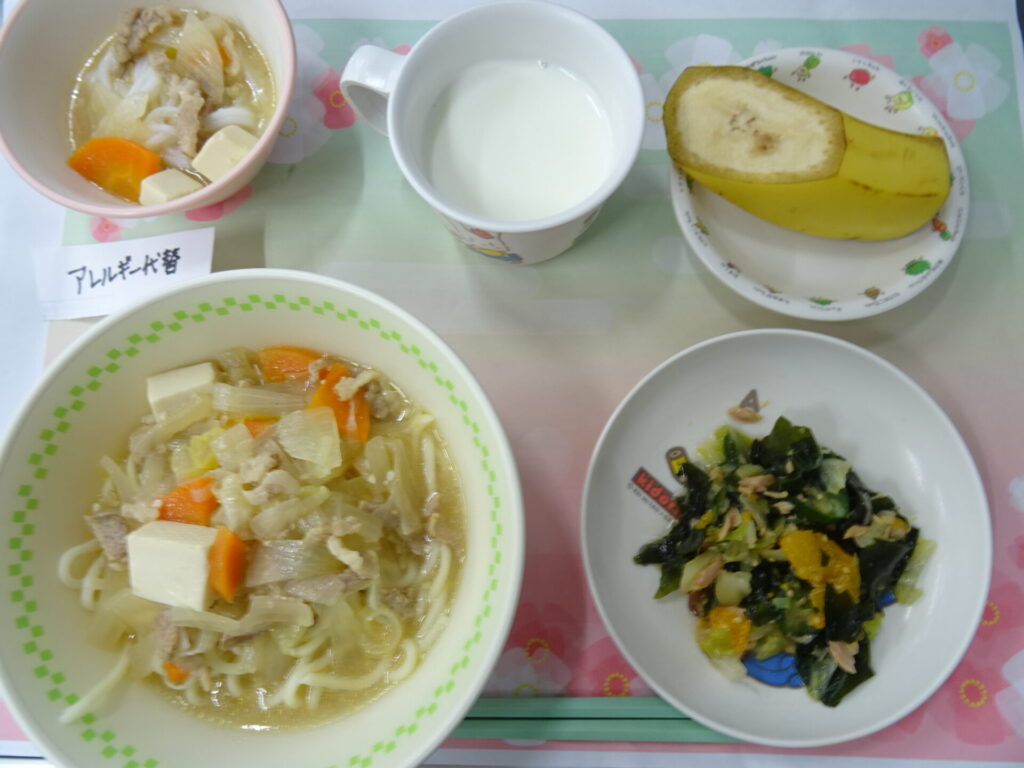 2月24日(火) 豚汁ラーメン わかめとツナのみかん和え バナナ 牛乳