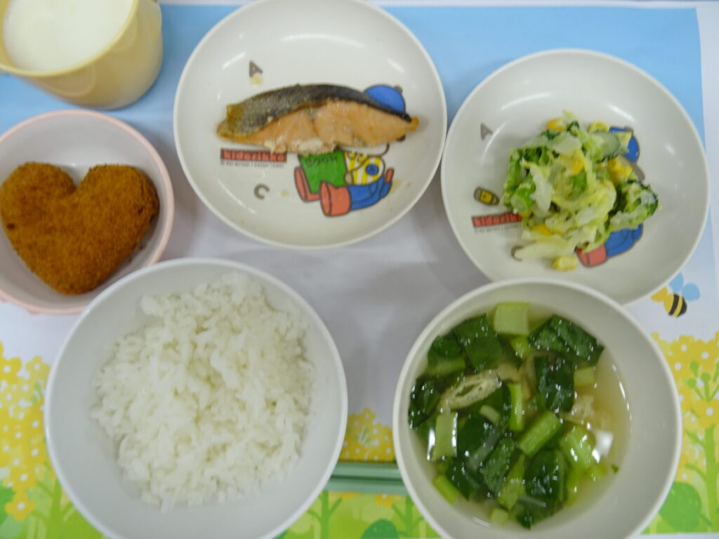 4月7日(火)ご飯 鮭の照り焼き(アレルギー代替食:ハート型コロッケ) きみどり和え みそ汁 牛乳